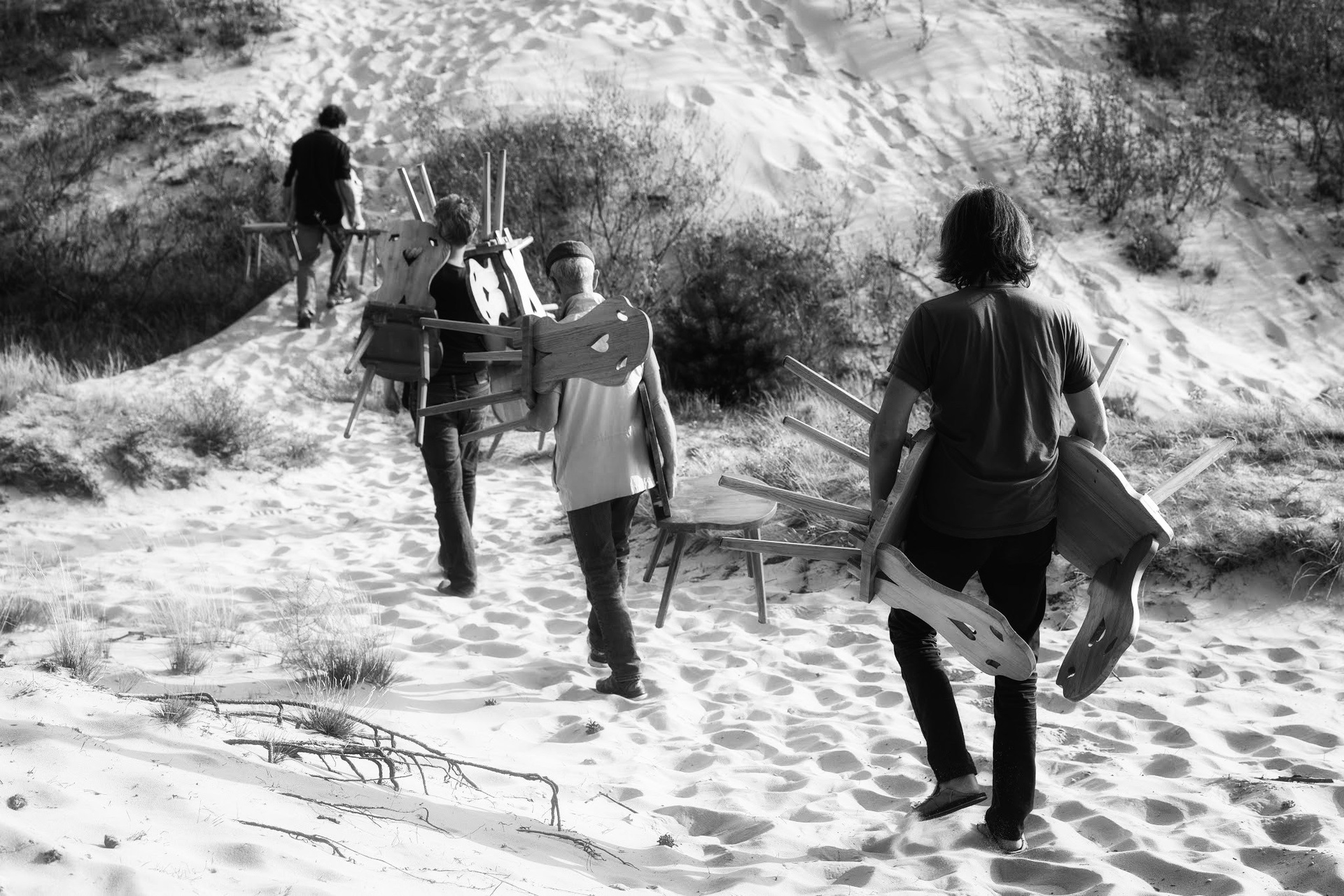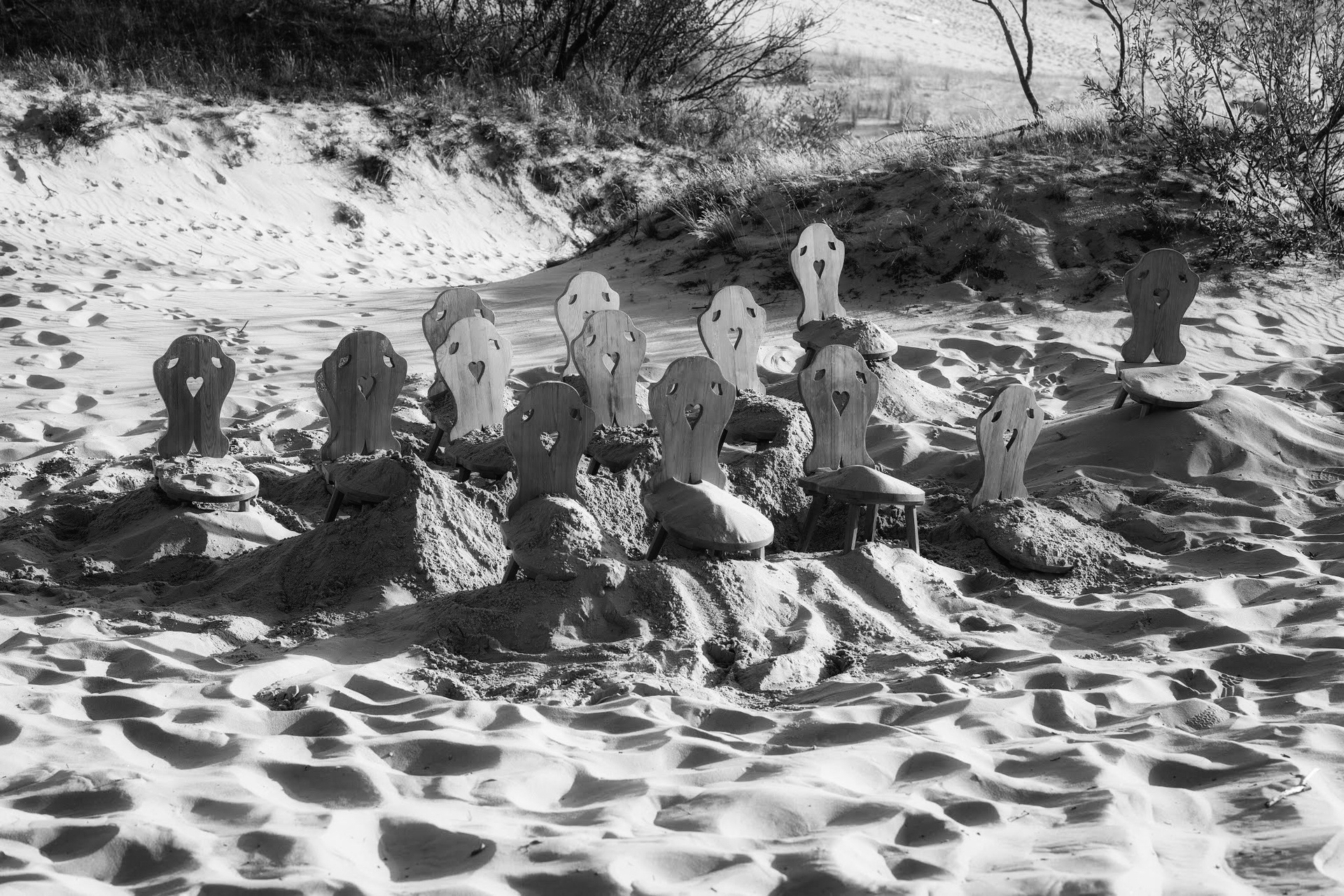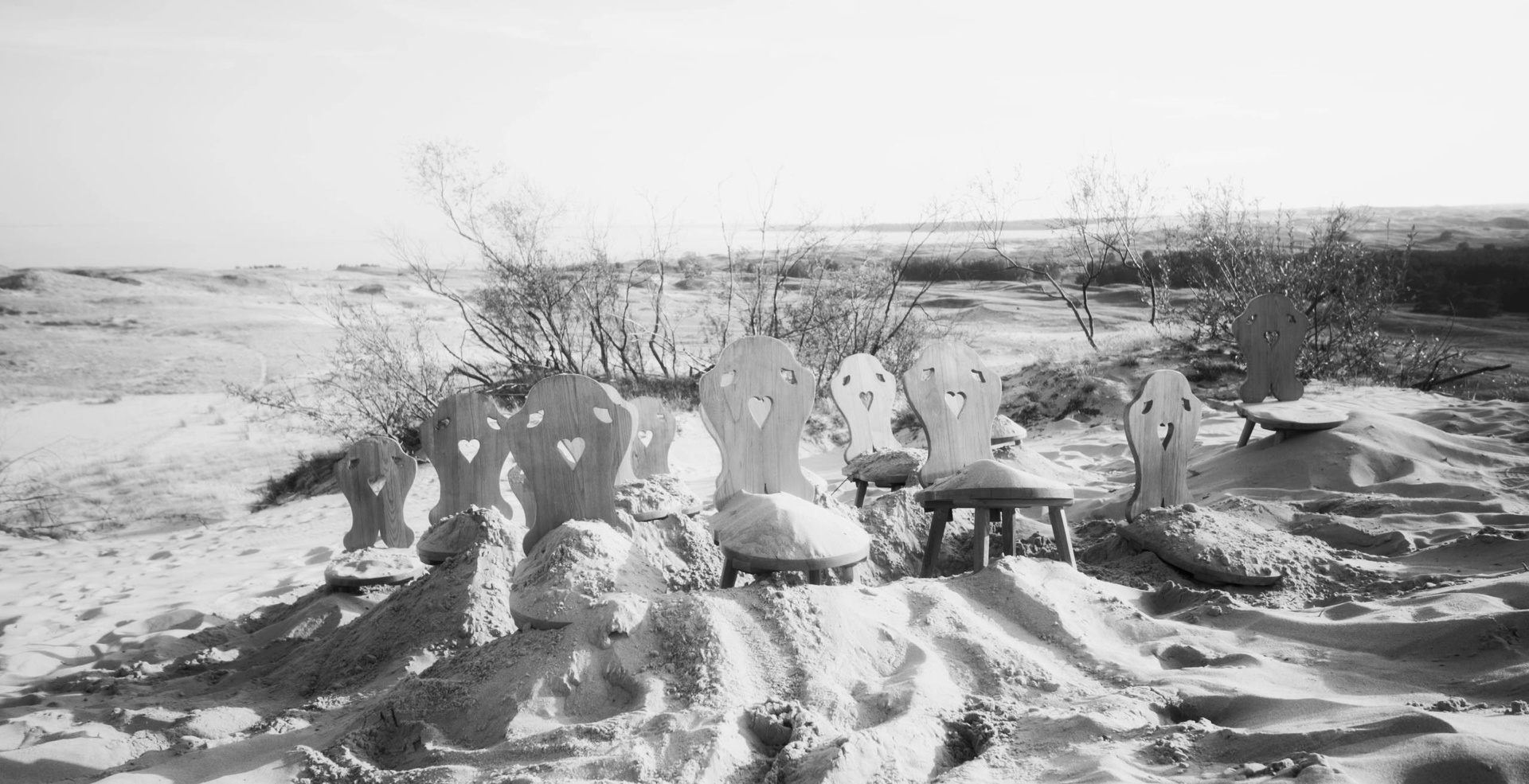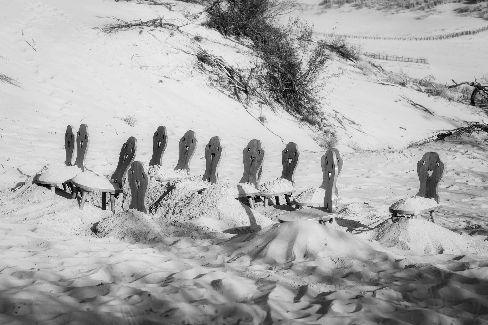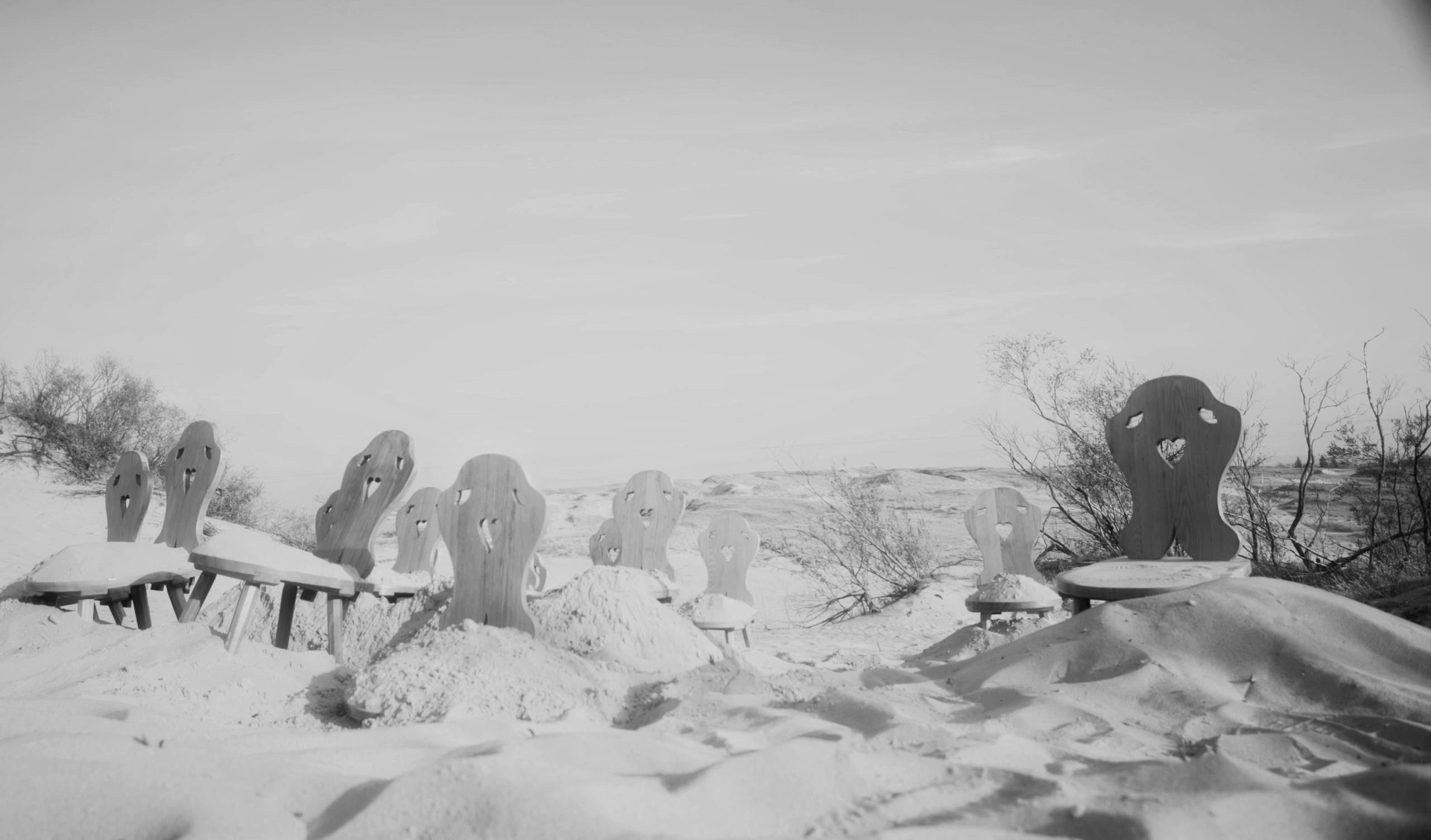 Художественная группа «Нежные бабы» предложила создать временный памятник жертвам песчаных катастроф в 2019 году в рамках художественно-исследовательской лаборатории «Балтийское море — жидкий мемориал», кураторами которой были Хорст Хохайзель и Андреас Книтц. Участники акции взяли старые деревянные стулья (они были максимально похожи) из Дома писателя в Ниде и перенесли их на дюну Парнидиса, где закопали в песок по спинку. Над поверхностью остались только вертикали спинок — ряд деревянных силуэтов, обращенных к дюне. С дюны Парнидиса открывается вид на так называемые «мертвые пески» — серые дюны, под которыми находятся погребенные деревни Сенеий Нагляй и Науйойи Нагляй. Эта композиция напоминает пустой зрительный зал или церковную скамью с множеством незанятых мест. Каждый стул обозначает место, где должен был бы сидеть человек. Один стул — одно место. Множество стульев — исчезнувшее сообщество тех, кто вместе выходил в море за рыбой, пережидал шторм и ждал хорошую погоду, пытался пустить свои корни в месте, где землю заменяет уходящий сквозь пальцы песок.