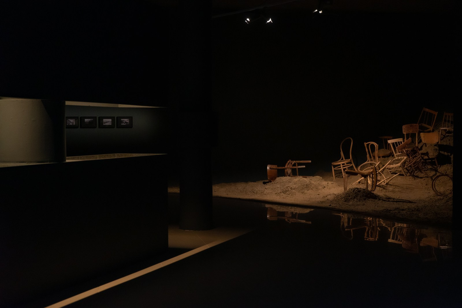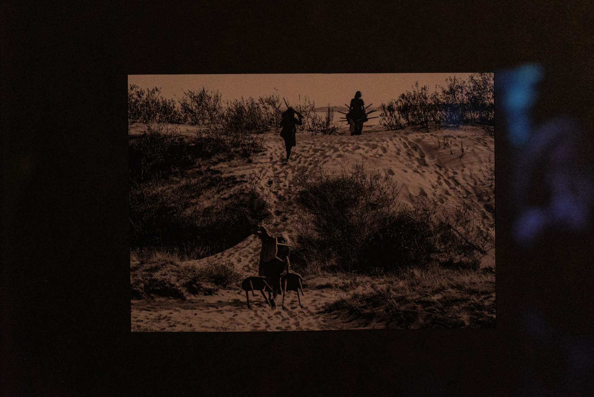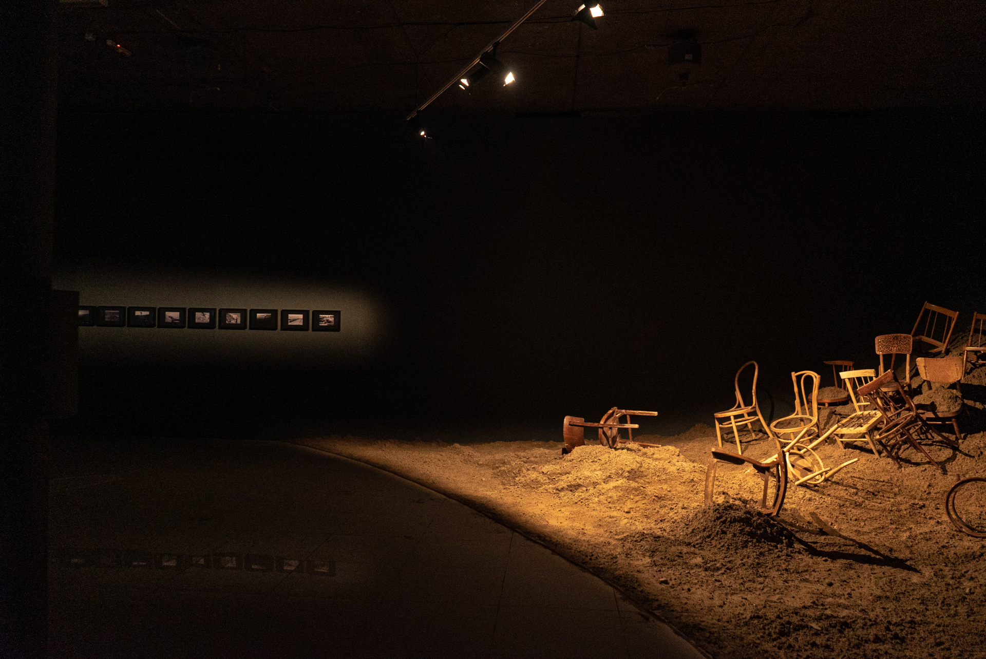 песок, деревянные стулья, архивные фотографии и фотодокументация перформанса