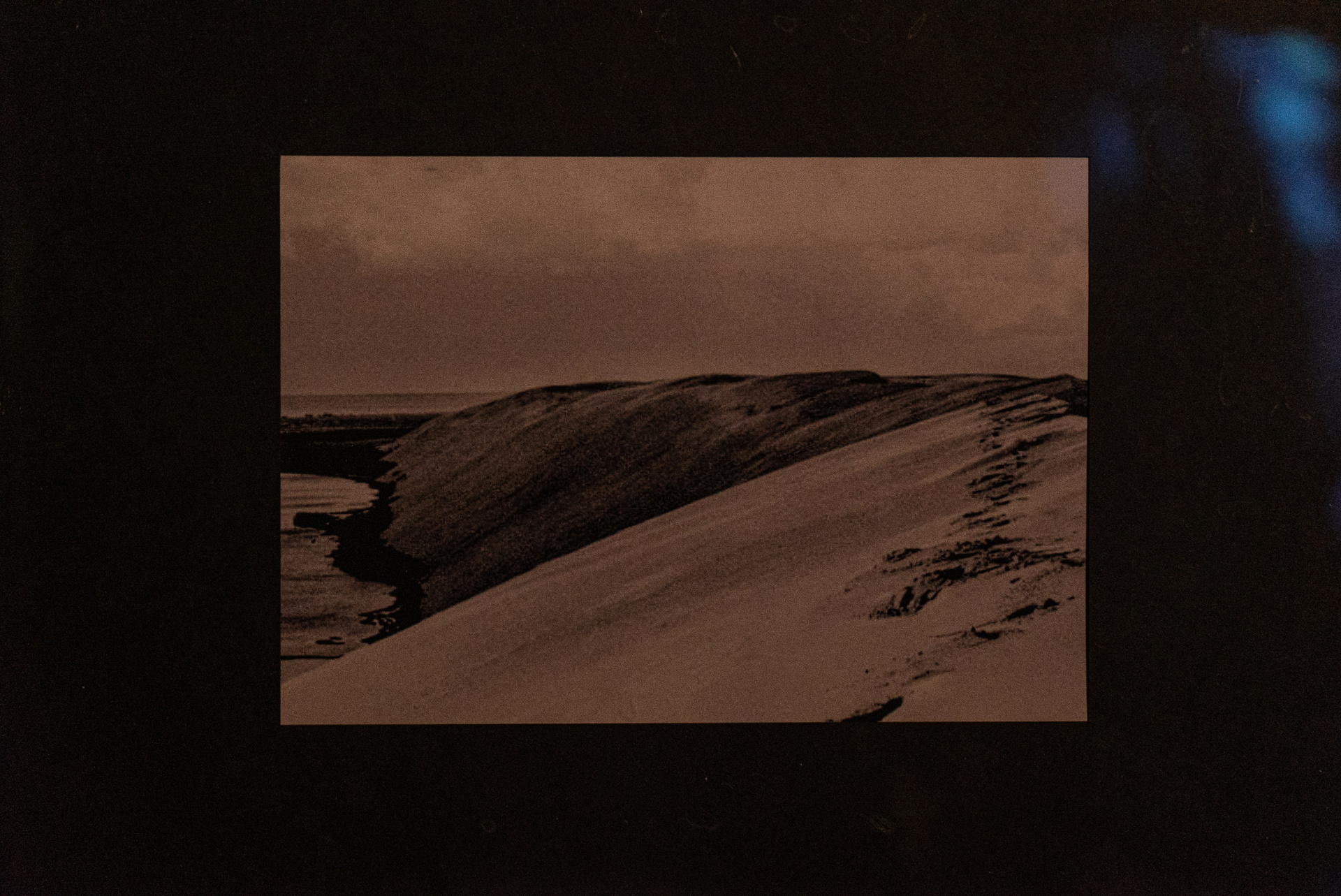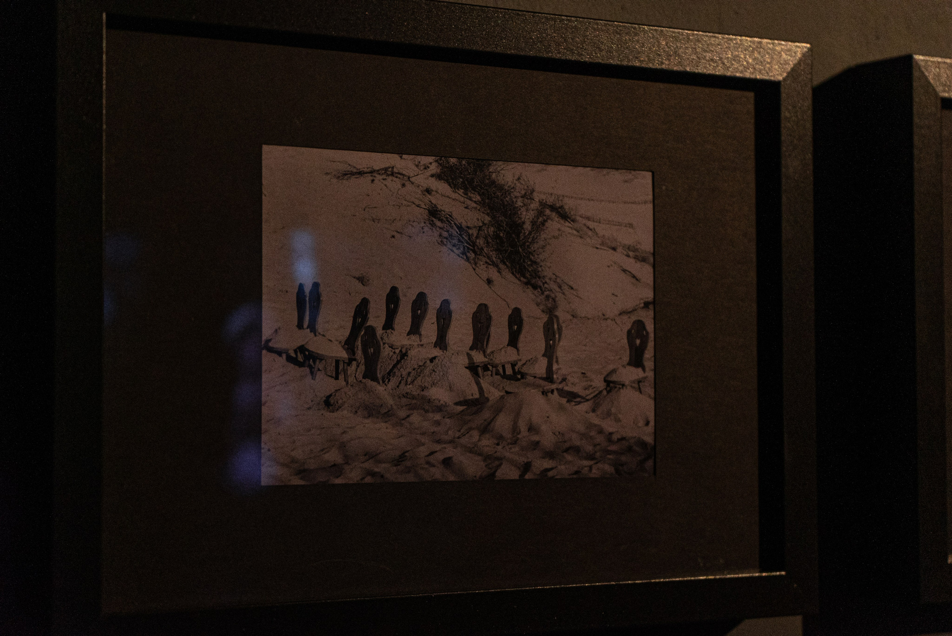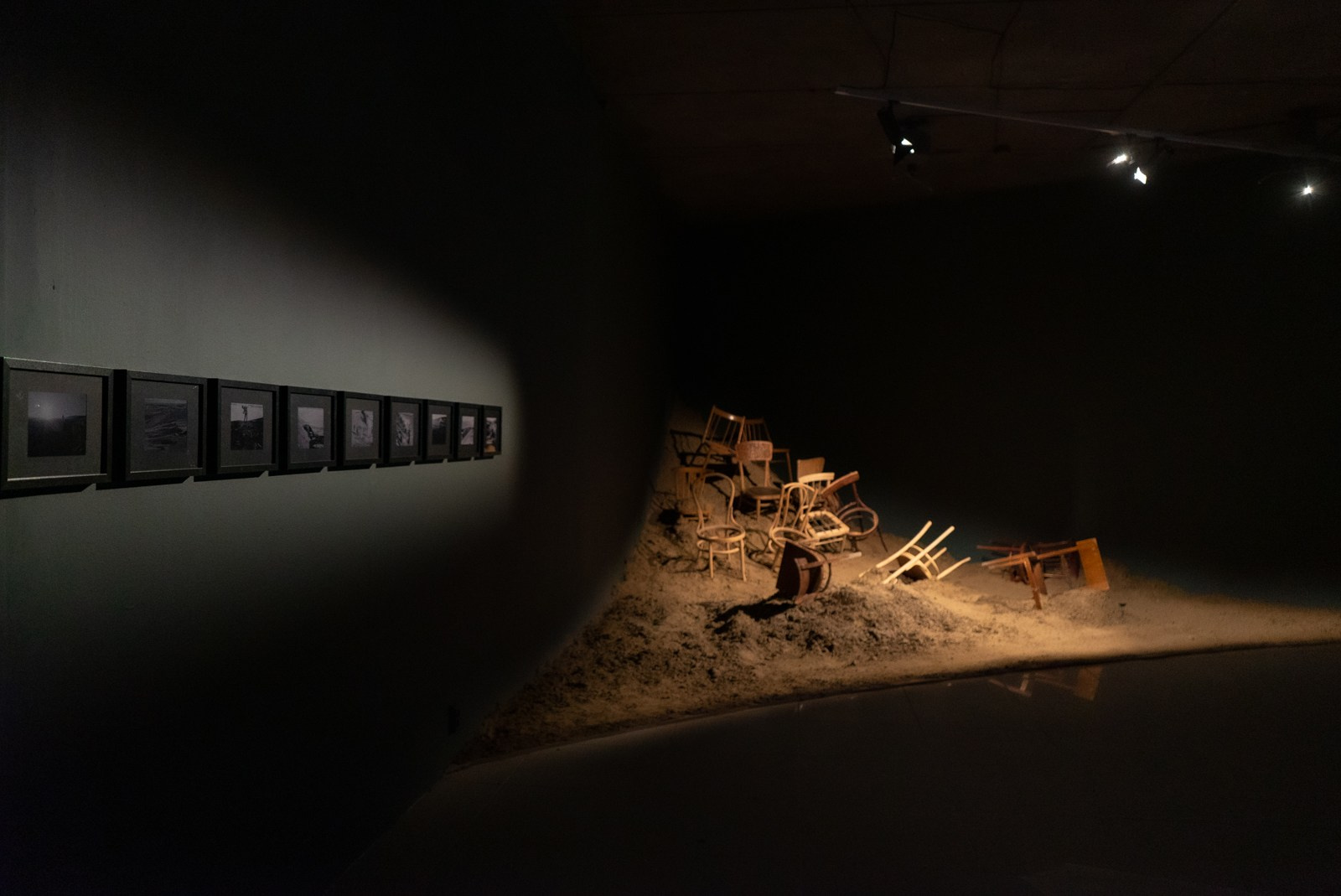На стене рядом с инсталляцией была представлена линия черно-белых фотографий: архивные кадры здесь были перемежались с документацией перформанса 2019 года. Решение использовать для изображений одну цветовую гамму было продиктовано желанием добиться большей условности и стереть временную дистанцию между снимками. В такой визуальной логике столетия, разделяющее фотографии немецкого исследователя, изучающего остатки деревень и выдутое песками кладбище и те изображения, которые были во время создания временного монумента в жаркий сентябрьский день 2019 года, не существует.