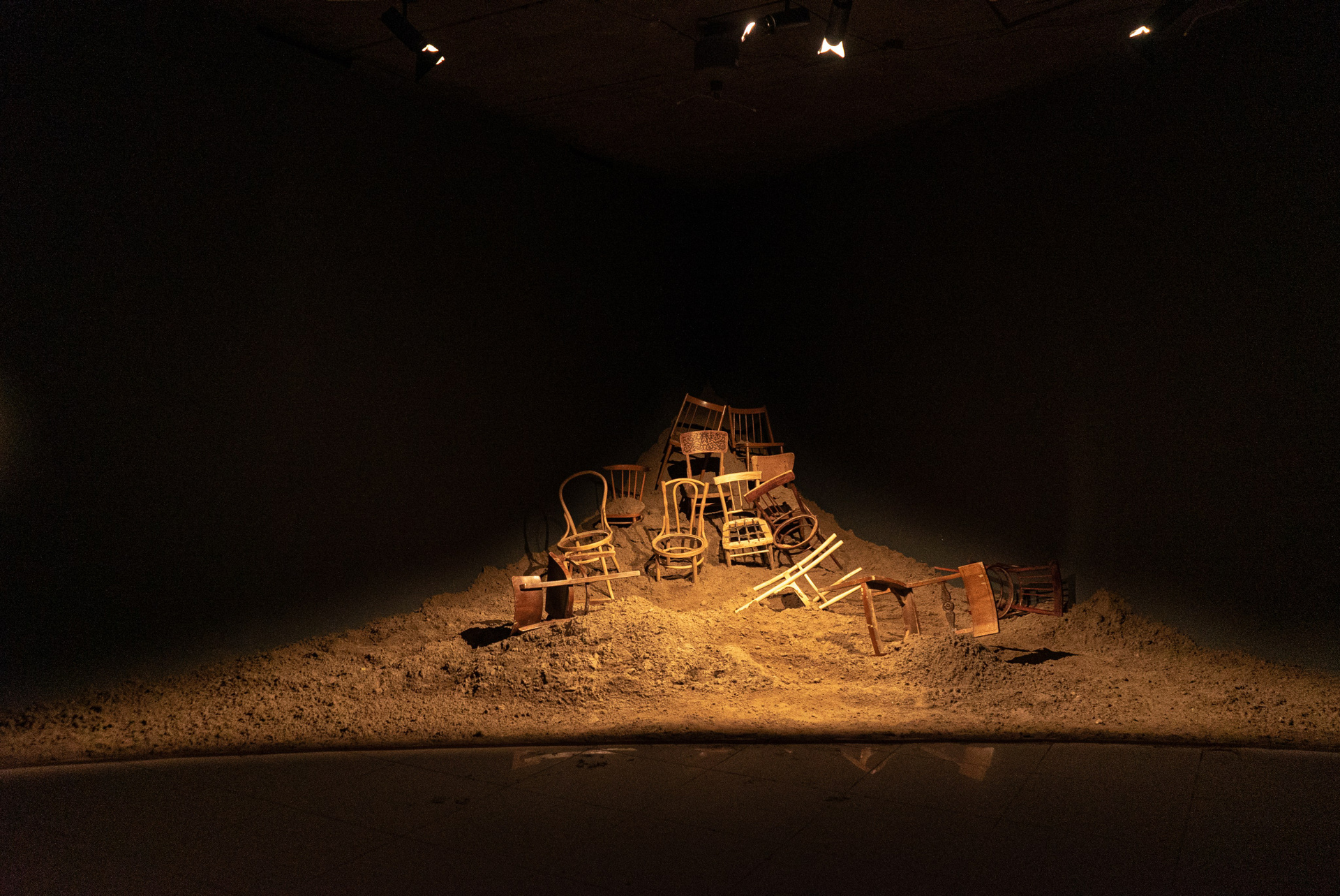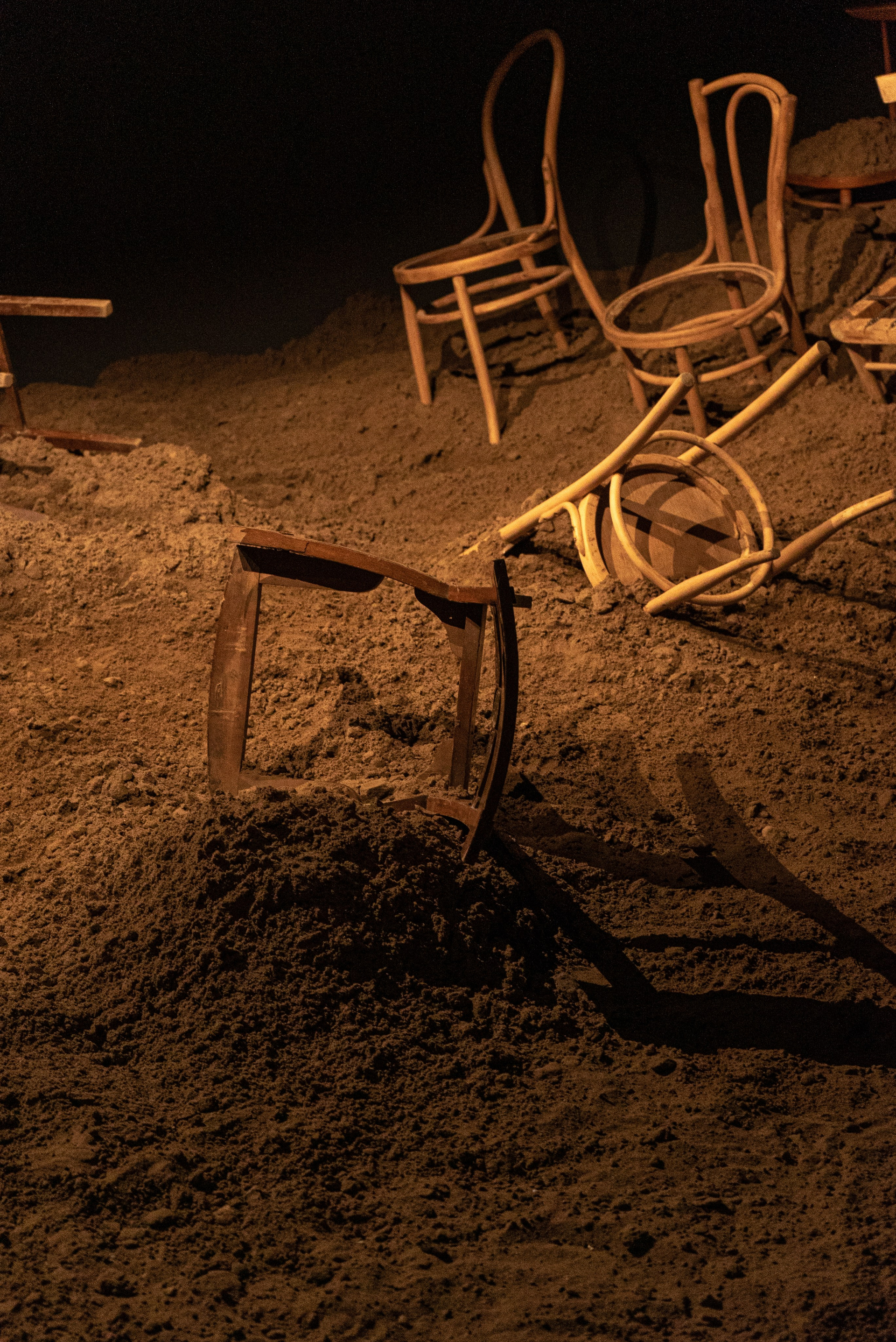 В отличие от той строгой и линейной композиции, которая была реализована в Ниде, здесь стулья — абсолютно разные, принадлежащие разным десятилетиям, частично поломанные — размещались хаотично, будто разбросанные невидимой силой. В этом пространстве история песчаных катастроф Куршской Косы становилась более универсальной. Теперь не предметы мебели стояли перед дюной, а зрители смотрели на них, как на археологические остатки чего-либо, универсальные знаки отсутствия, указывающие на то, что в этом месте когда-то был человек. Посетители выставки узнавали о судьбе засыпанных деревень, но одновременно начинали соотносить увиденное со своим опытом утраты и памяти. Некоторые люди делились впечатлениями и собственными воспоминаниями. Кому-то инсталляция напоминала о затопленных деревнях Пермского края. Другие вспоминали кадры новостных репортажей после пожара в пермском клубе «Хромая Лошадь», жертвами которого стало более 150 человек: там и сгоревшая и уцелевшая мебель оказалась засыпана песком.