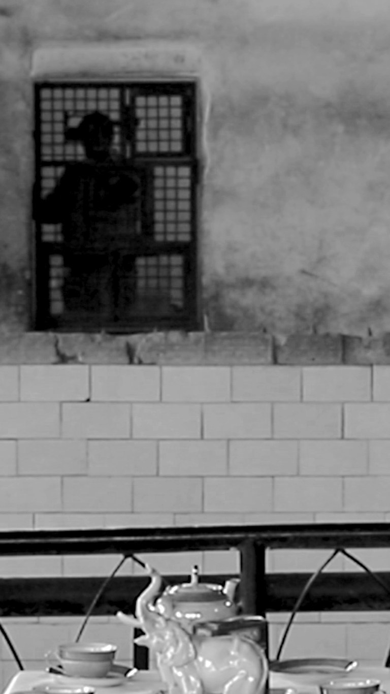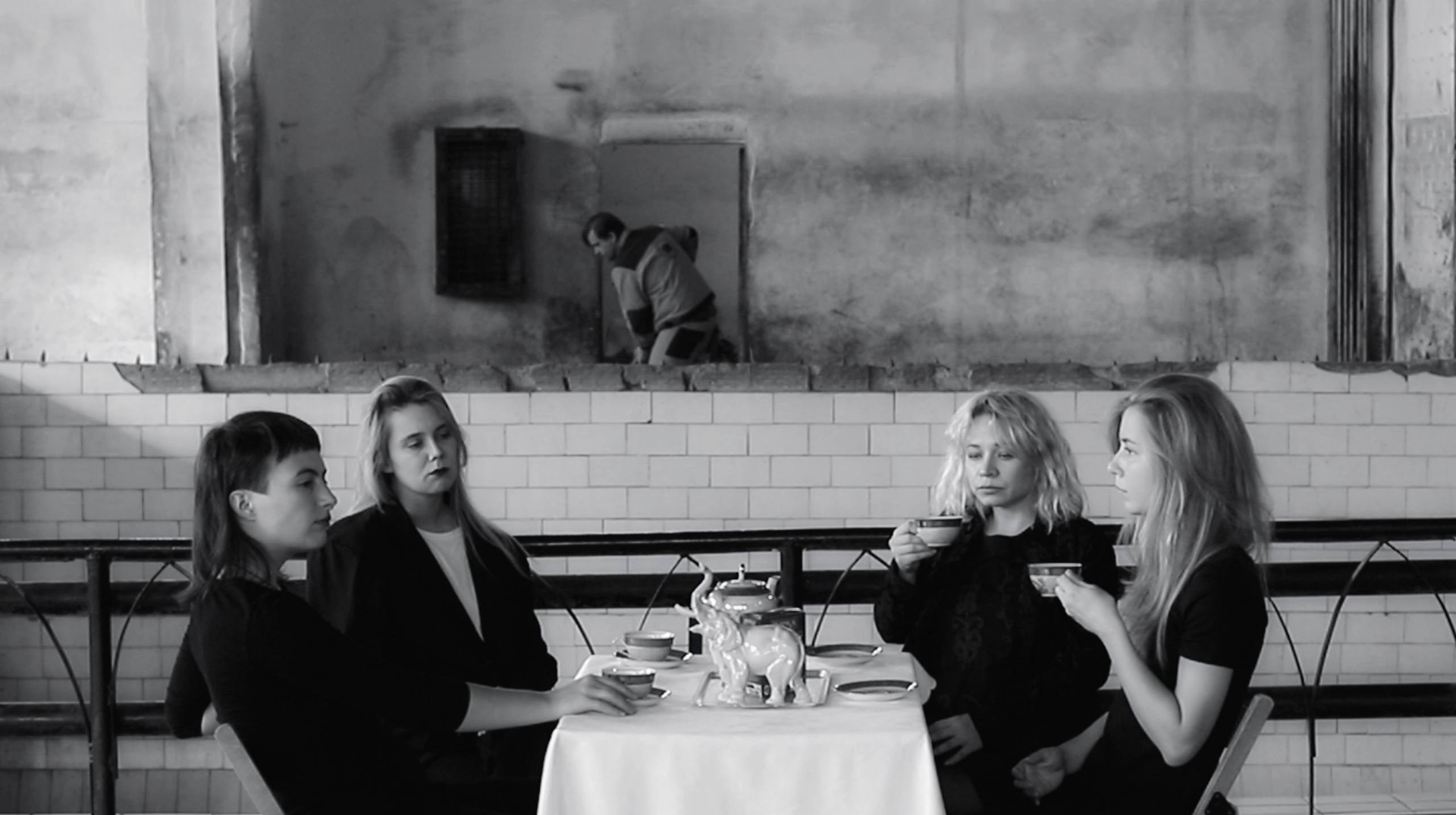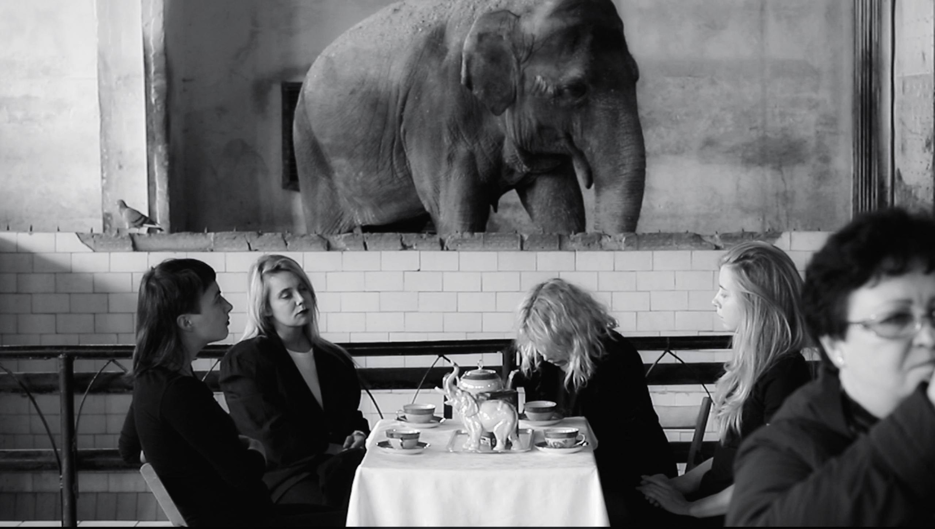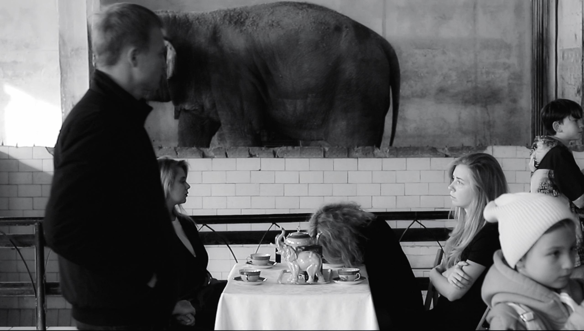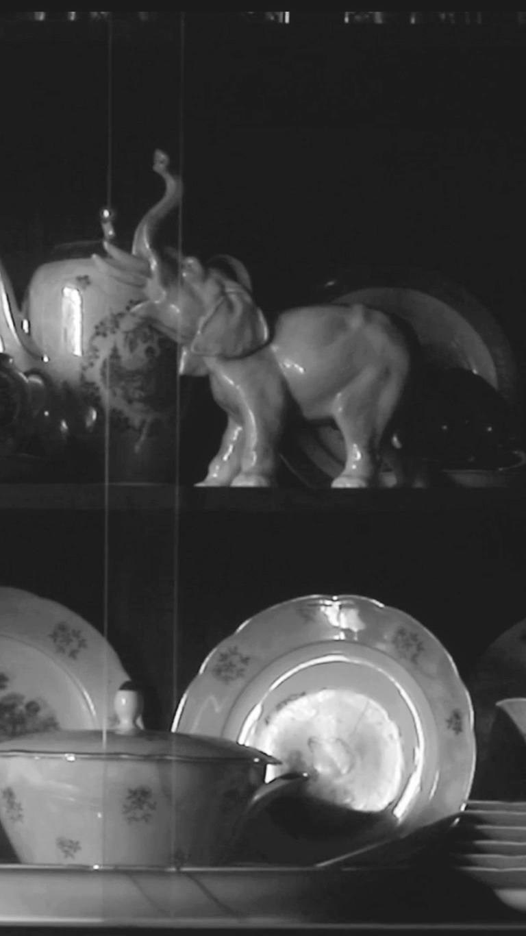 Четыре участницы сидят за столом в павильоне зоопарка и неспешно пьют цейлонский чай из советских фарфоровых чашек. Сцена напоминает одновременно семейное чаепитие и рекламный образ прошлого: на столе стоит фарфоровая статуэтка слона, многократно разбитая и бережно склеенная ее хозяйкой — бабушкой художницы, Людмилой Васильевной Маховой. Места сколов аккуратно покрыты перламутровым лаком для ногтей, невольно отсылая к технике кинцуги — «золотого ремонта» керамики, хотя сама реставрация возникла из бытового стремления сохранить дорогую сердцу вещь, а не из знания художественной традиции.