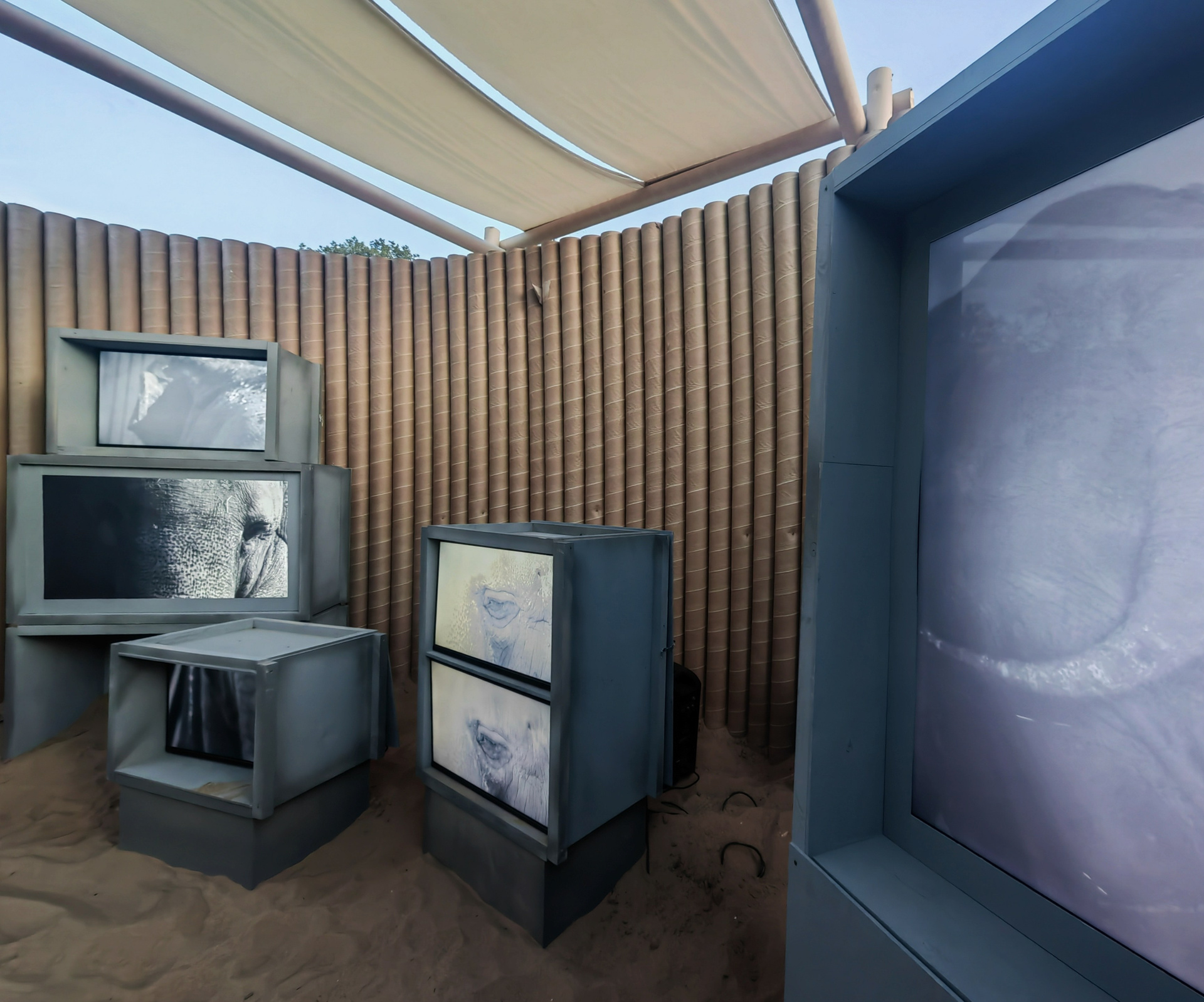 Инсталляция представляет собой серию фанерных блоков, выкрашенных в серый цвет. Каждый блок состоит из системы клеток-ячеек, занятых видеоплазмами разных размеров. На экранах транслируется монохромное видео — крупные планы движущегося тела слонихи Преголи, практически абстрактные фрагменты поверхности кожи. Оставшиеся ячейки заполнены волжским песком, благодаря чему изображение оказывается буквально встроенным в среду пляжа, а граница между экспозиционным объектом и ландшафтом становится размытой.