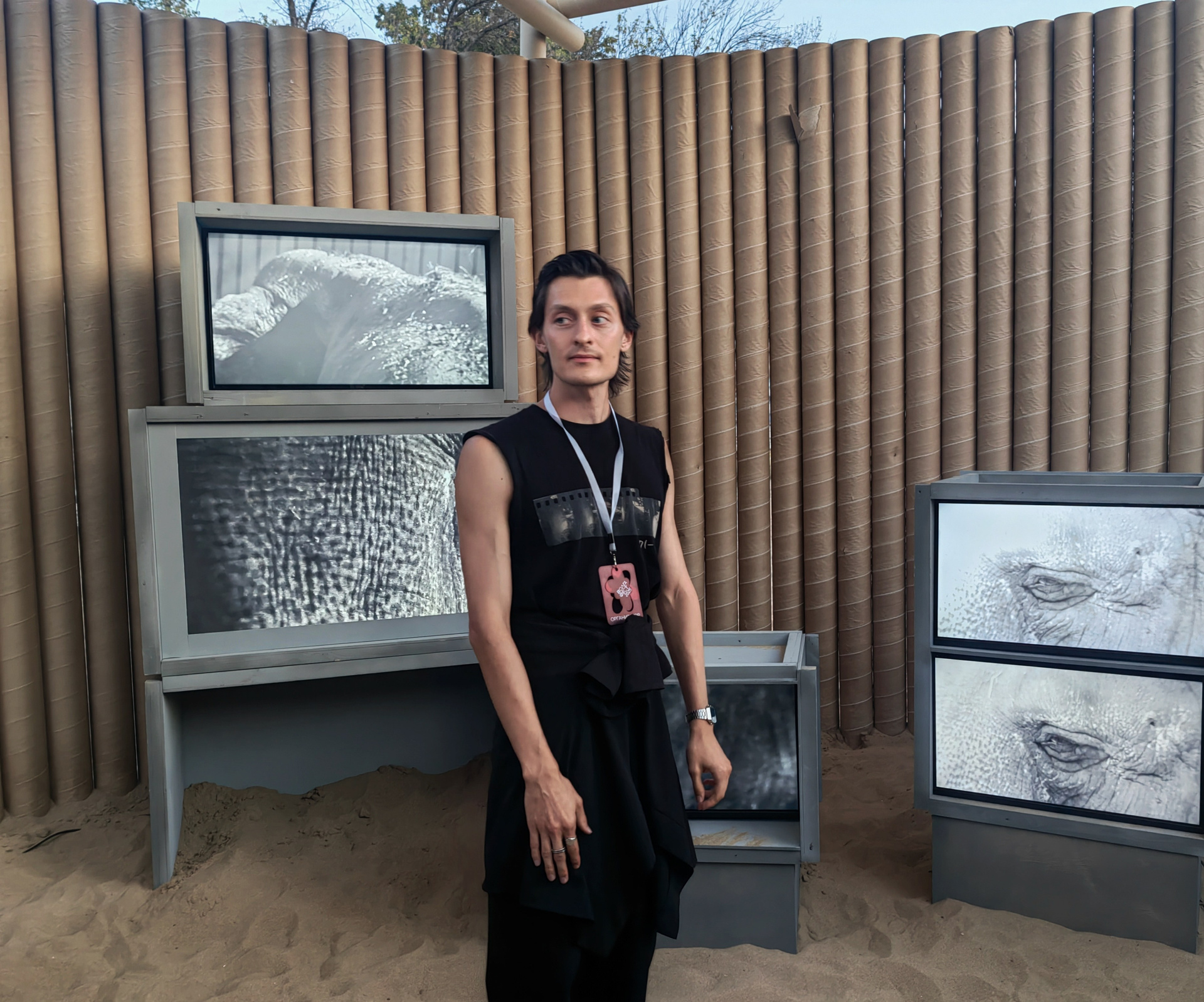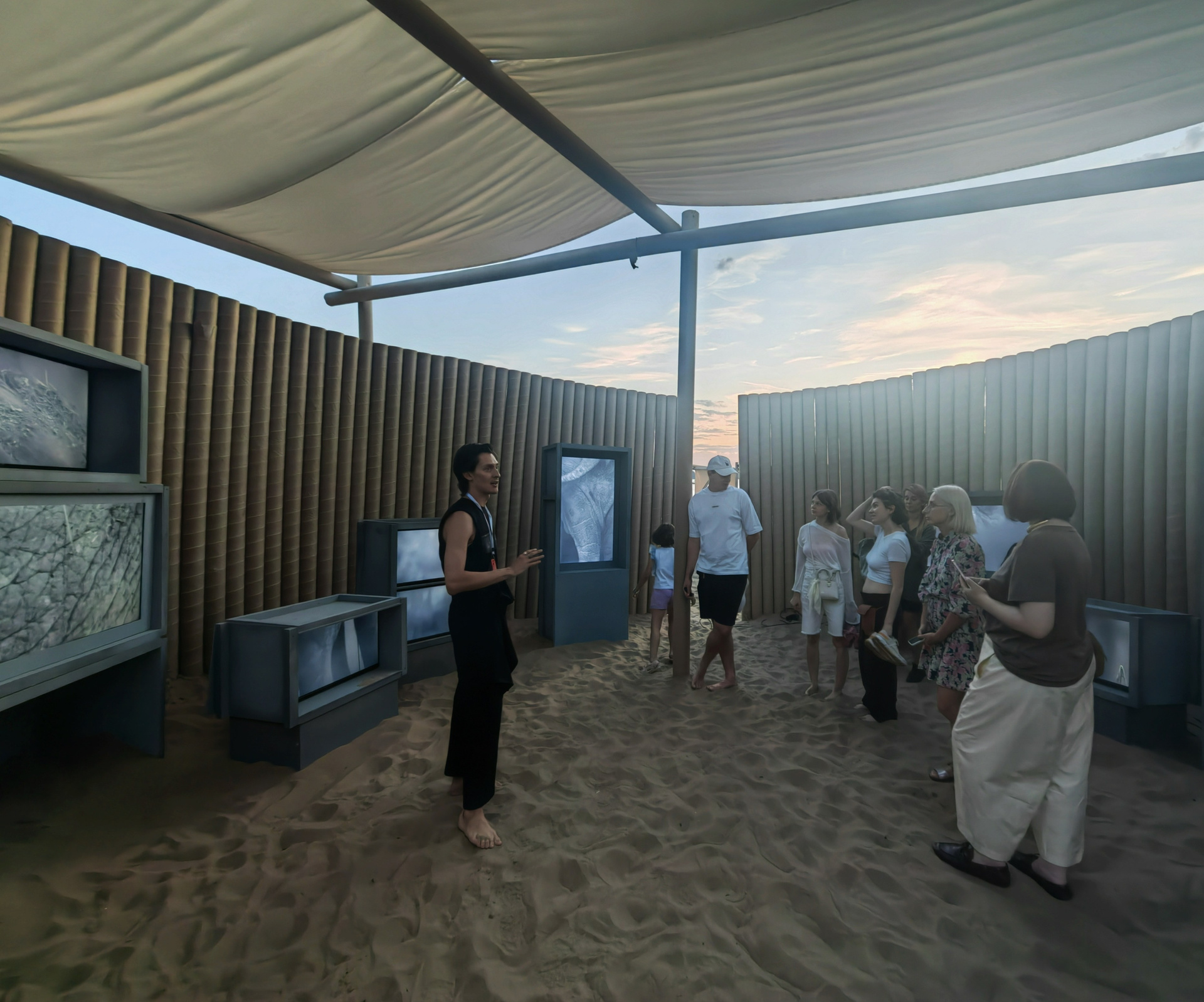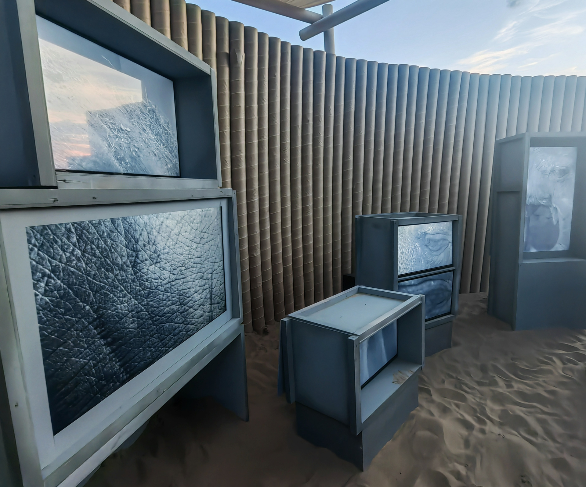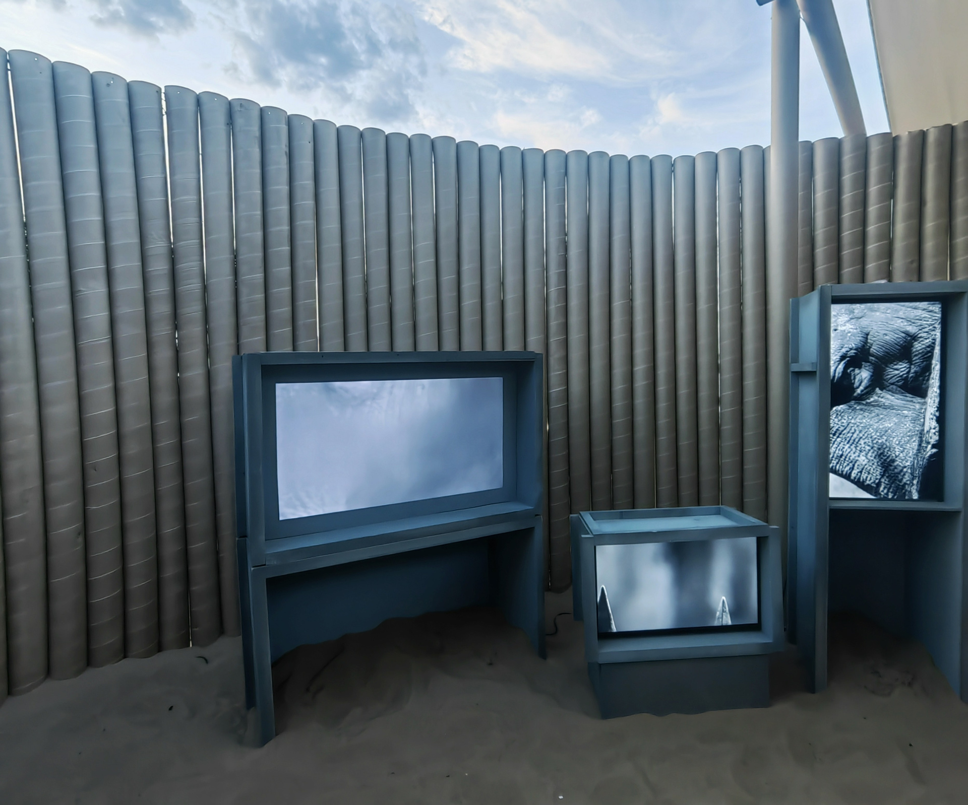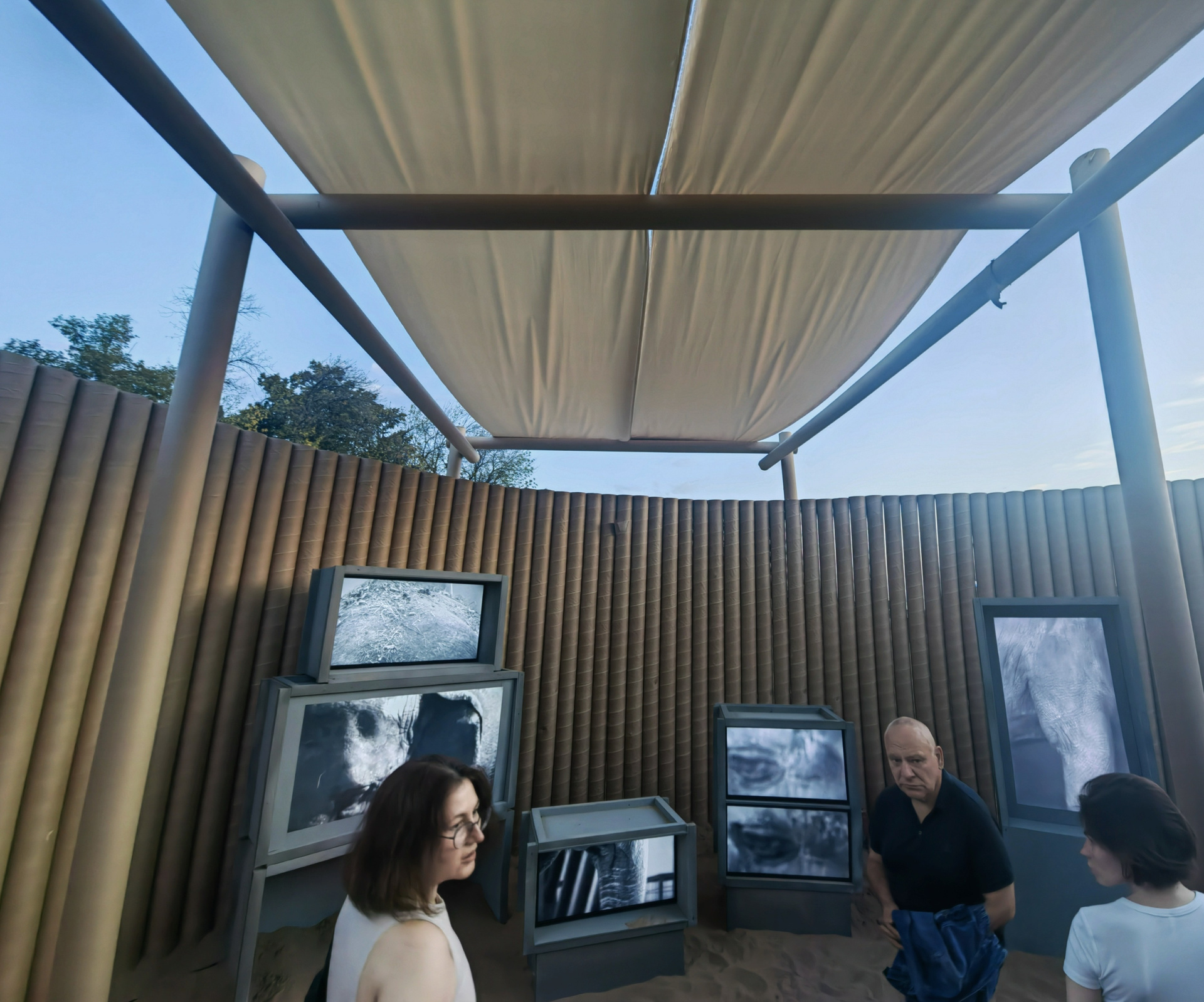 Все художественные ячейки фестиваля были оформлены в единой архитектурной стилистике так называемых «галерей-песчанок» — временных павильонов, встроенных непосредственно в пляжный ландшафт. Эта унифицированная структура задавала общий визуальный каркас экспозиции и подчеркивала ее сезонность и временность (она работала три дня). Работая внутри заданной архитектуры, «Нежные бабы» стремились использовать ее ограничения как часть художественной логики, превратив пространство павильона в устройство фрагментарного восприятия.