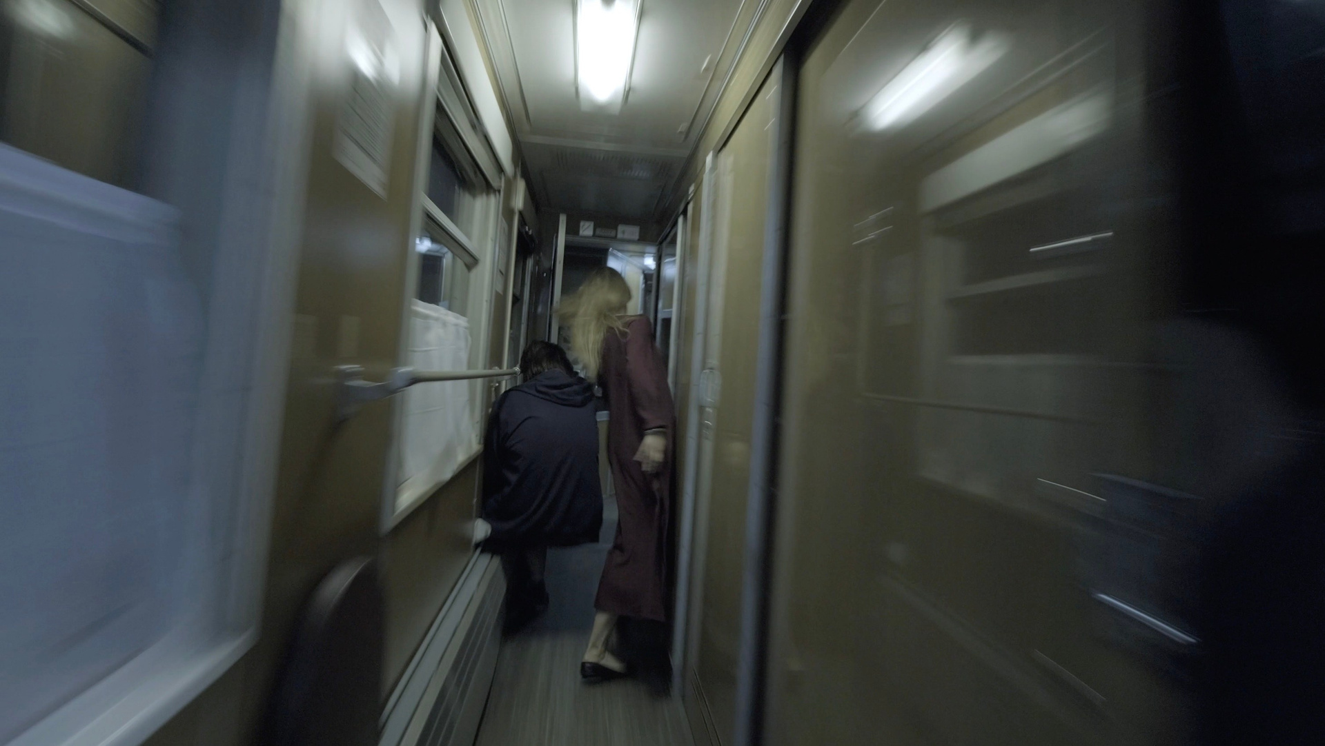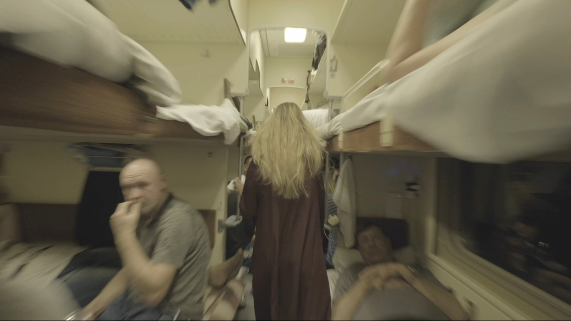 Девушка с длинными распущенными волосами в длинном красивом платье и туфельках стремительно, сбиваясь с торопливого шага на бег, идет по вагонам поезда. Из одного в другой, весь состав из конца в конец, коридоры вагонов «повышенной комфортности», обычных купейных, плацкартных, где маются матери с детьми, дрыхнут солдаты и бесятся — hello! привет! чего ходите? а вы русские? — школьники. Тугие двери, тамбуры, межвагонные переходы, где кто-то курит тайком. Идет, бежит, идет, огибая людей в проходах, у туалетов и титанов с кипятком, уворачиваясь от свернутых в гигантские рулоны матрасов, иногда оглядываясь на следующую по пятам камеру. Дойдя до конца, до последней, намертво запертой двери, поворачивает обратно, и все повторяется: коридоры, двери, тамбуры, переходы, школьники, солдаты. В памяти всплывает слово «бустрофедон» — видео «Транссибирский ковчег» (2018) и правда похоже на текст, дошедший до конца строки и повернувший вспять. Причем, судя по ритму — коридор как стопа, переход как цезура, — текст поэтический: бессмысленная поэзия бессмысленного действия обретает смысл в ритмических сбоях. В основе всего — рифма между поездом, летящим из одного конца империи в другой, и пассажиркой, пробежавшей по составу с головы до хвоста. Впрочем, у этой поэзии имелся институционально- и даже социально-критический подтекст. Видеоперформанс был сделан в ходе железнодорожного вояжа, которым начался проект «Немосква», когда ГЦСИ, поглощенный РОСИЗО, пытался доказывать, что способен на нечто грандиозно-креативное в масштабе всей страны: интернациональную команду кураторов и художников провезли по Транссибирской магистрали от Москвы до Владивостока с ознакомительно-гастрольным туром, в результате чего перед неизвестными героями локальных сцен должны были открыться космические карьерные перспективы. «Транссибирский ковчег» можно прочесть как иронический автопортрет художника в дежурной роли арт-мигранта, кочующего из резиденции на фестиваль в полной боевой готовности — с вечерним туалетом на случай вернисажа или ужина с меценатами: звезда проносится по вагонам разных классов, воочию сталкиваясь с социальным расслоением, и возвращается в зону комфорта, где так безлюдно и стены приятного цвета слоновой кости.