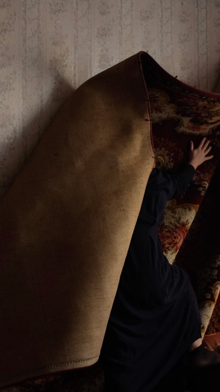 Две другие части триптиха происходят в пространстве квартиры и связаны с личной историей Евгении Лаптевой. В доме своей бабушки она выполняет два простых действия: снимает ковер со стены и скатывает ковер с пола. 45 лет «экспонирования» ковров в квартире закончились с уходом их владелицы.