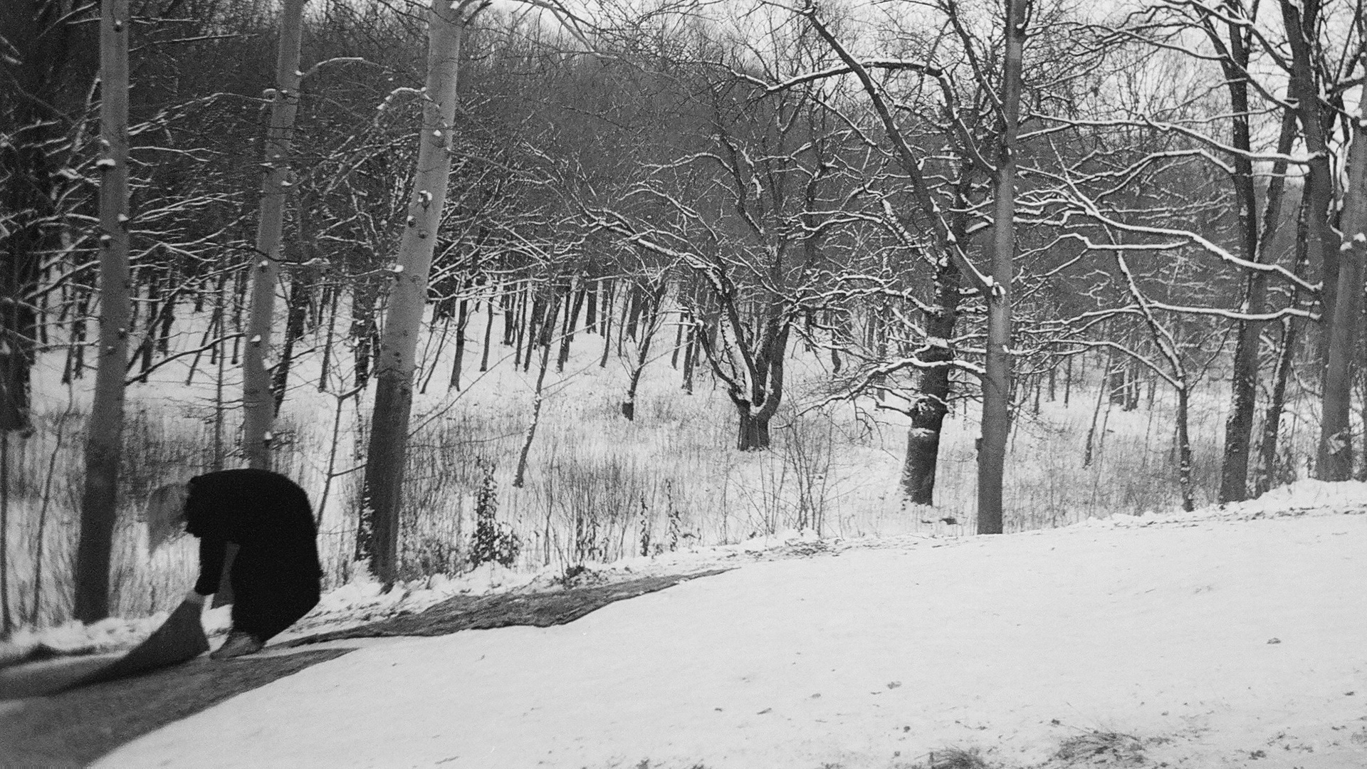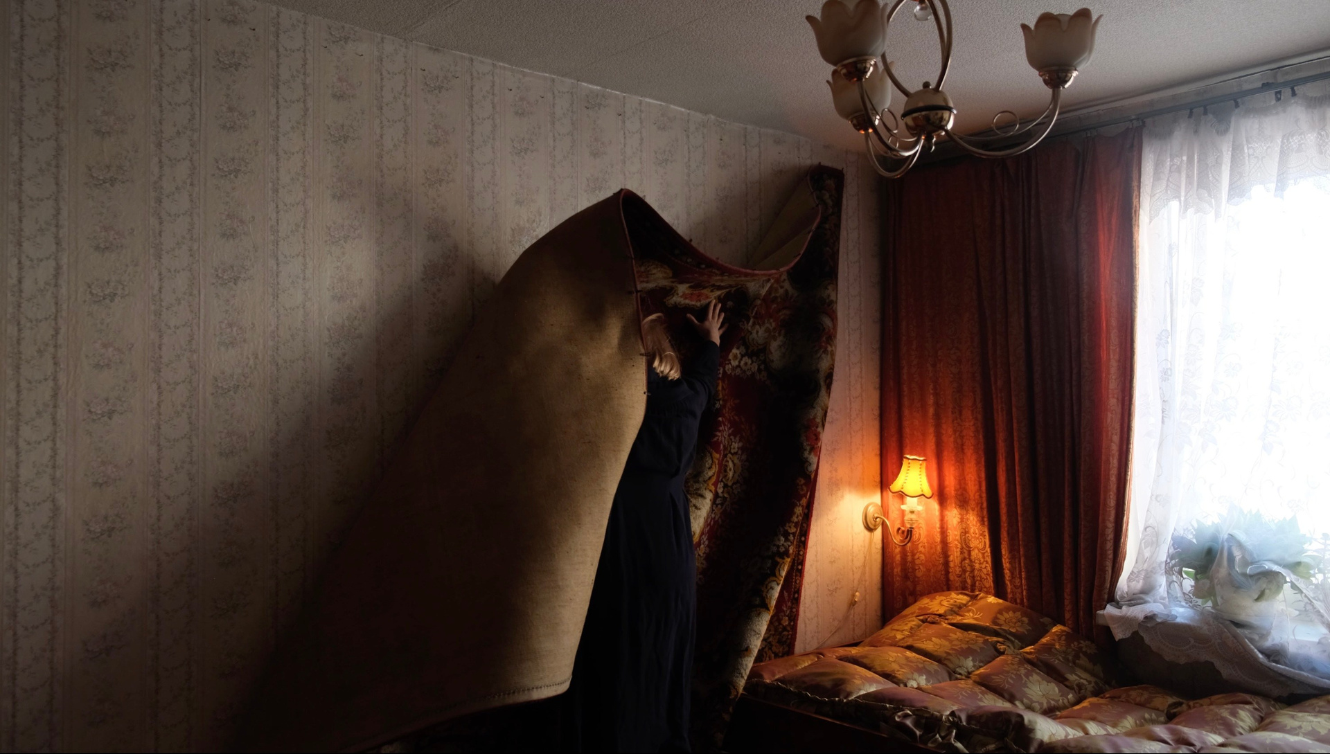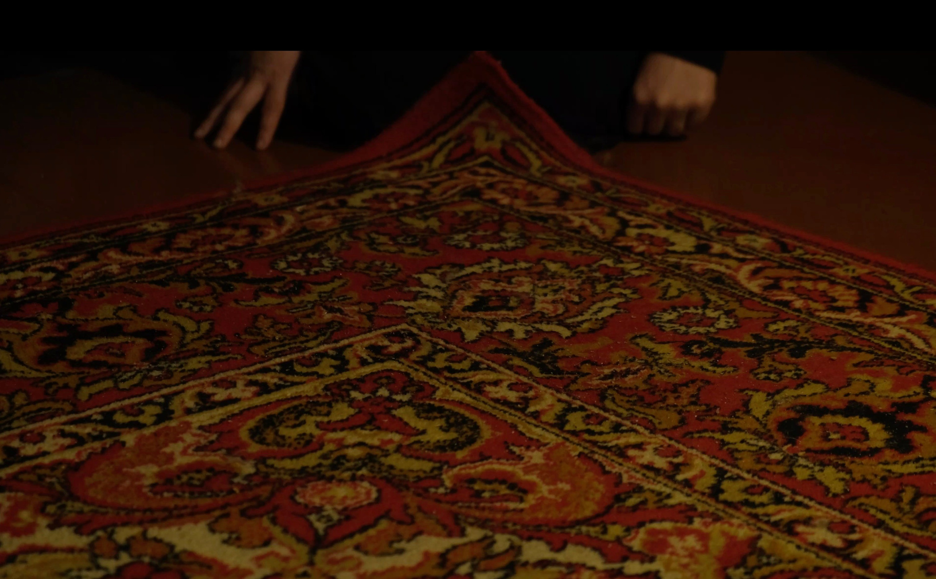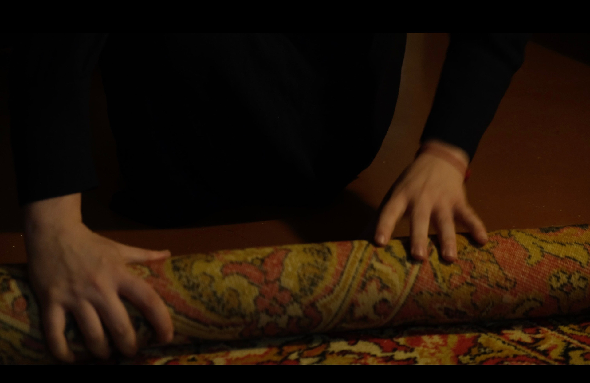 В заключительной сцене художница сворачивает лежащий на полу ковер. Долгие годы он был важной частью интерьера большой комнаты, гостиной: на него старались не наступать, чтобы не повредить ворс и рисунок, его чистили, он был в своем роде знаком благополучия и в тоже время защищал ноги владельцев от холодного пола, да и вообще скрывал неприглядное покрытие, окрашенное масляной краской. По мере того, как героиня перформанса скатывает ковер, поверхность пола постепенно освобождается. Пространство комнаты меняется на глазах: привычный орнамент, на долгое время определивший визуальный центр зала, исчезает и уступает место простой глянцевой плоскости пола. Утрачивает прежнюю функцию и ковер: он больше не греет, не украшает, а просто становится тяжелым и пыльным свитком, самая нарядная и красивая часть которого повернута внутрь, к самой себе.